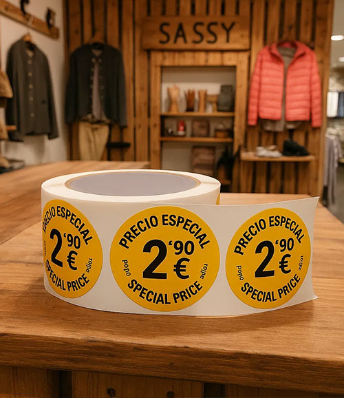 Rollos de etiquetas adhesivas redondas de polipropileno, resistentes al agua y al desgaste, con barniz antiarañazos. Ideales para stickers baratos, productos, envases o embalajes. Personalizables en diseño y tamaño, listas para usar.