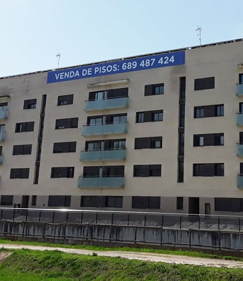 Lona de PVC microperforada de 320 g/m², ideal para publicidad en fachadas, vallas de obra y zonas expuestas al viento.
